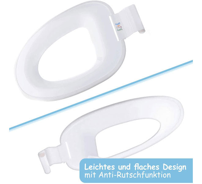 Die simple patentierte Plastik-Klammer befestigt den Kindersitz rutschfest und zuverlässig auf dem originalen Toilettensitz der Erwachsenen. Dank des leichten und flachen Designs, können die Kinder den Ring hoch- und runterklappen und so einfach, sicher und selbständig auf’s WC gehen.